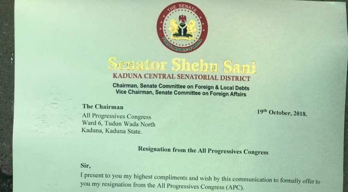 Special Adviser on Media to Shehu Sani, Abdulsamad Chima-amadi, confirmed to Newsweb Express that his principal has sent his resignation letter to the party’s ward executives.