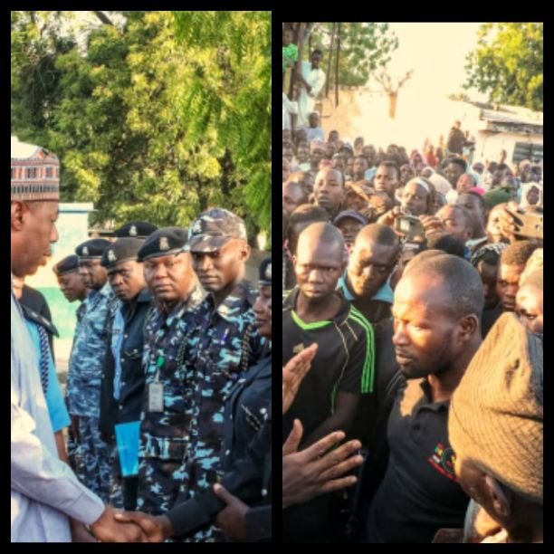 Borno Governor, Babagana Umara Zulum Thursday morning visited 350 Borno indigines who are currently undergoing Police recruitment training at the Borno state Police college, Maiduguri, donating food items and cash to them.