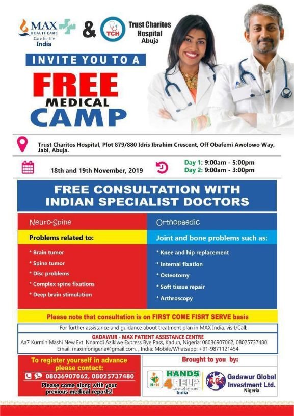 SPONSORED! Max Healthcare-India and Trust Chariot Hospital-Abuja invite you to attend Free medical Consultation camp on Orthopaedic and Neuro surgery issues